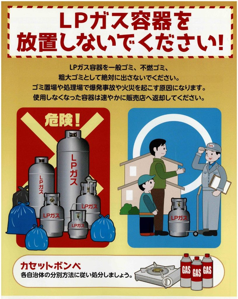 LPガス容器は、一般ごみ・不燃ごみ・粗大ごみとして廃棄することができません。